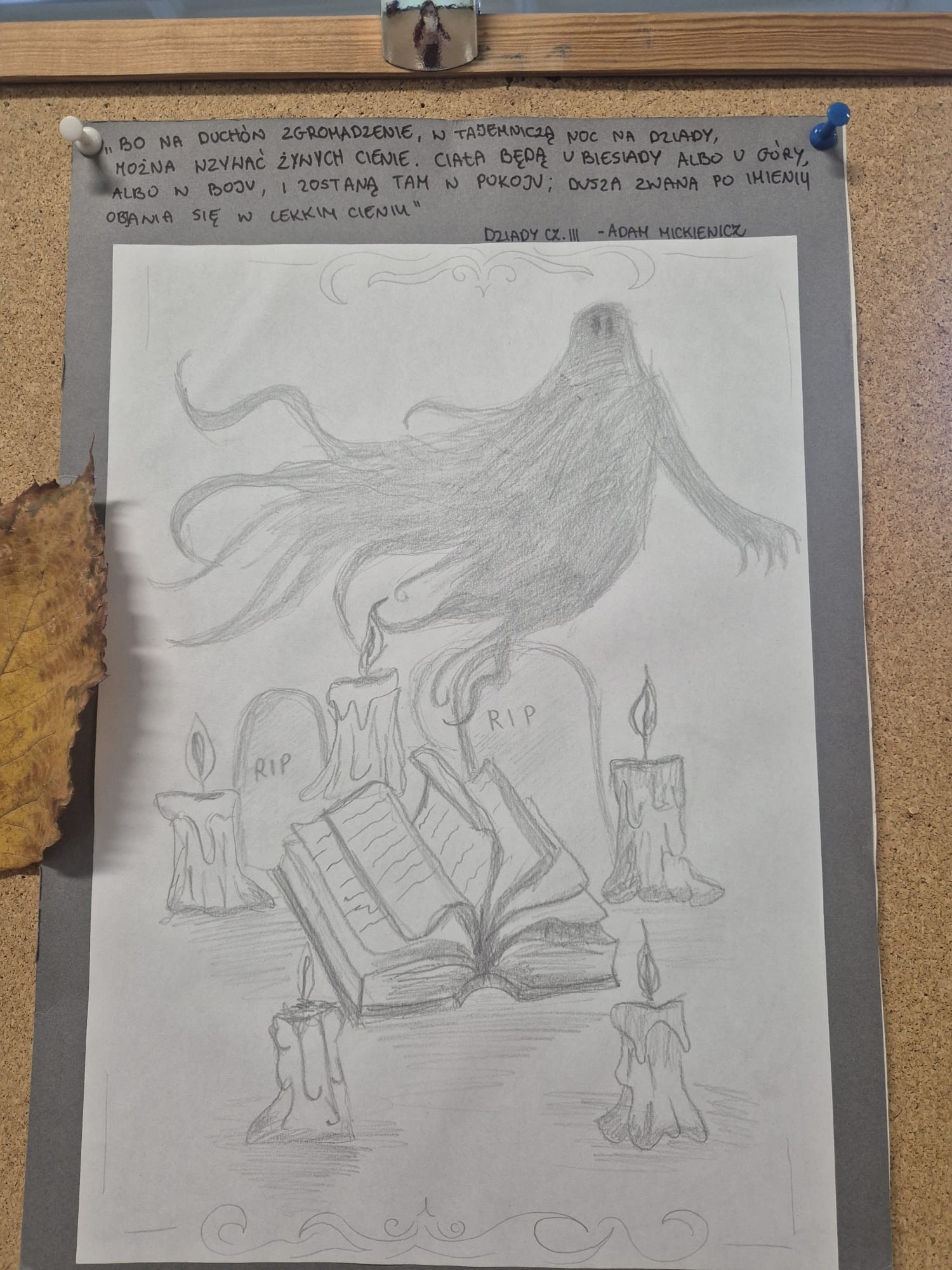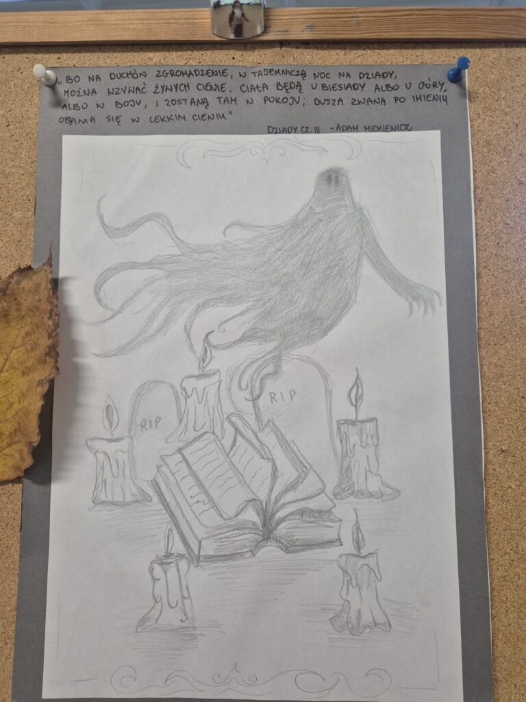 Zapraszamy do obejrzenia wystawy prac przygotowanych w ramach konkursu dotyczącego literackich obrazów obrzędów związanych ze zmarłymi. Autorzy prac zainspirowali się m.in Dziadami Adama Mickiewicza, Chłopami Władysława Reymonta, Odyseją Homera oraz romantycznymi balladami. Wystawę prac można obejrzeć na korytarzu na 1. piętrze.