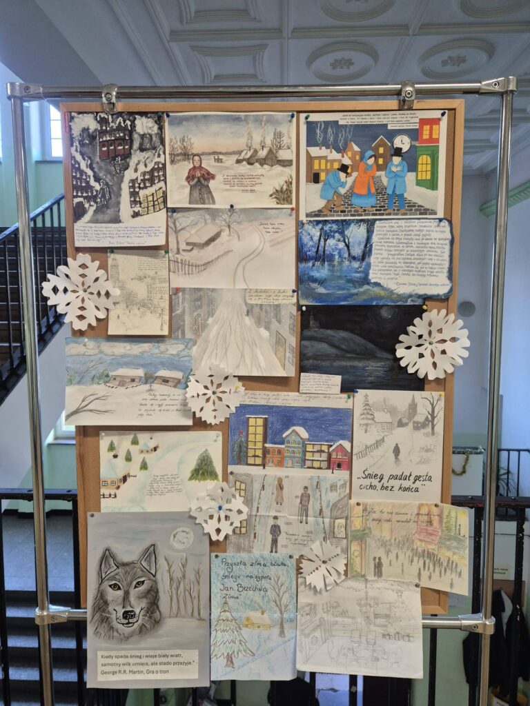 Uczniowie ZS1 stworzyli prace dotyczące obrazu zimy w literaturze. Na 1. piętrze można oglądać wystawę tych pięknych projektów.