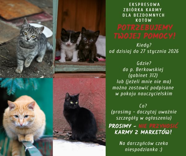 Tym razem tylko KARMA. Koty są bezwzględnymi mięsożercami – zwróćcie uwagę na jakość karmy min. 70% mięsa (lepiej przynieść małą saszetkę porządnej niż worek czegoś po czym koty mogą się pochorować – nie przyjmujemy karmy marketowej).